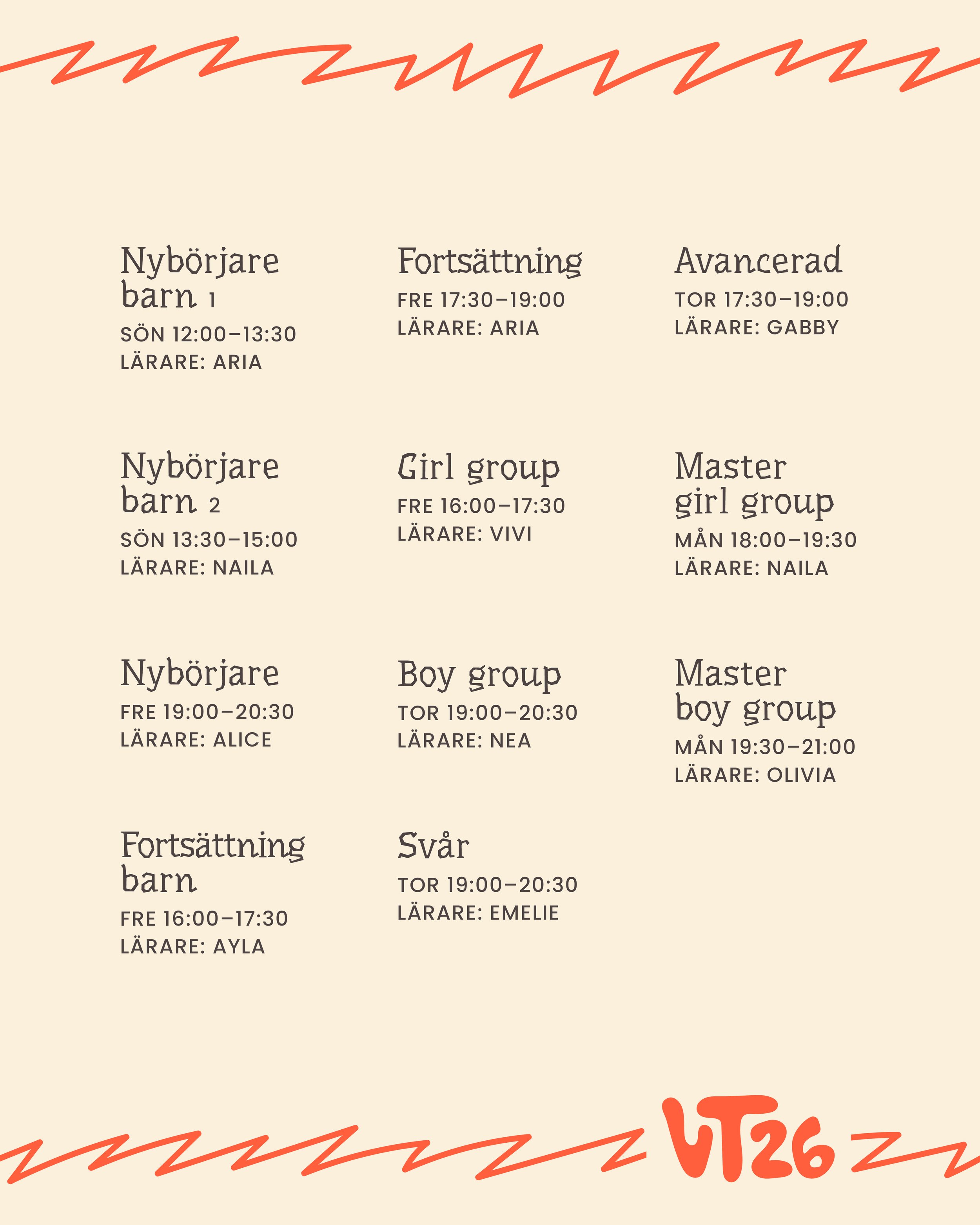 Notera att prova på klasserna inte är på sina ordinarie tider! Mer info om kurserna samt tiderna för resten av terminen hittar du under Våra kurser.